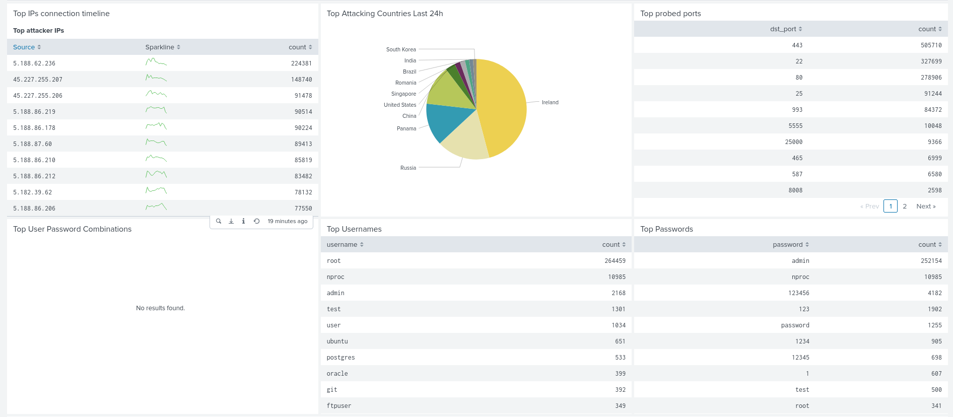 As well as the attacker scripts we can also see what username and password combinations that were tried. It’ll probably suprise no one that the most common username seen was “root” with the most common password as “admin”. This data is really useful to understand what passwords to avoid but also may help us further understand what devices are being targetted if we see unusual passwords that are associated as the default with one particular device.