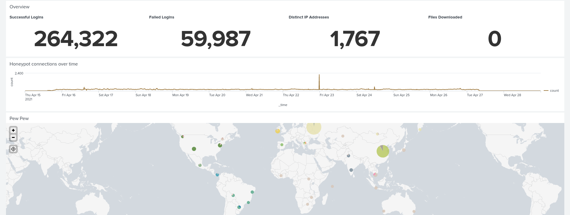 After running it for about 13 days the system had been logged into successfully 264,000 times from around 1700 different IPs. This is a staggering amount considering that I didn’t tell anyone about this system and this is purely traffic from attackers/researchers scanning the IPv4 space.