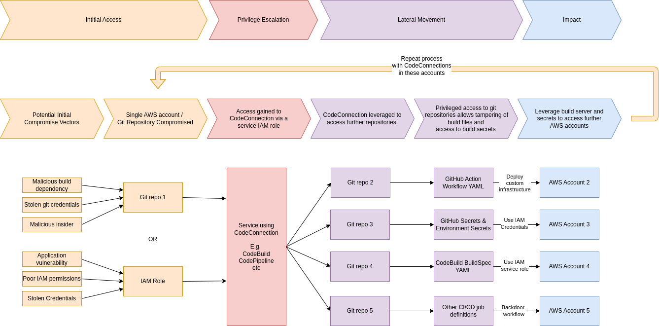 In the next few posts we’ll be looking at ways of exploiting these permissions granted to CodeConnections to get privilege escalation across code repositories and AWS accounts. Below is a diagram showing the potential set of attack scenarios that we are looking to build via different AWS services.